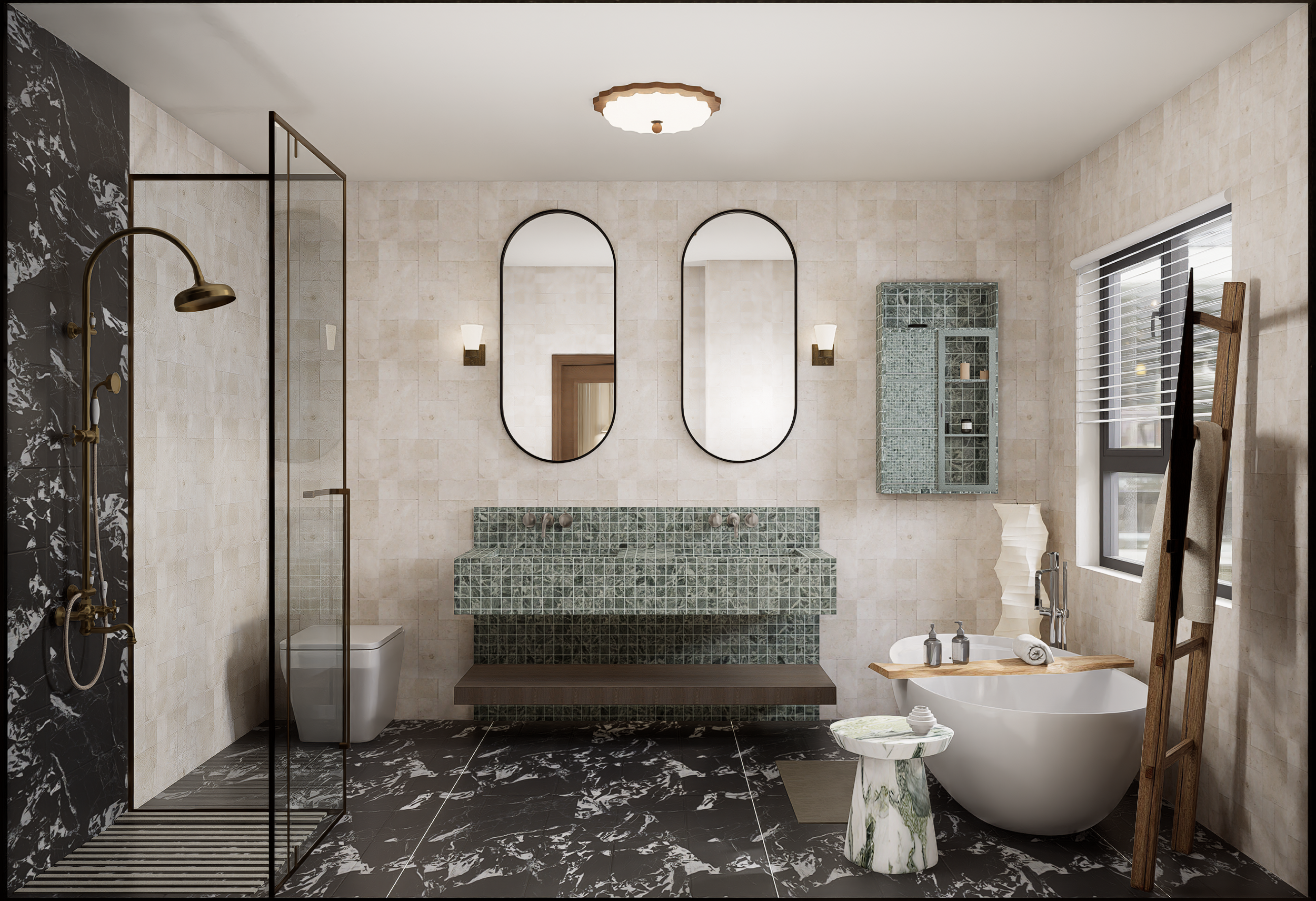 A spa-like retreat with natural stone textures, soft lighting, and clean architectural lines. The palette emphasizes warmth and tranquility, blending organic materials with modern fixtures to create a sanctuary for relaxation and renewal.