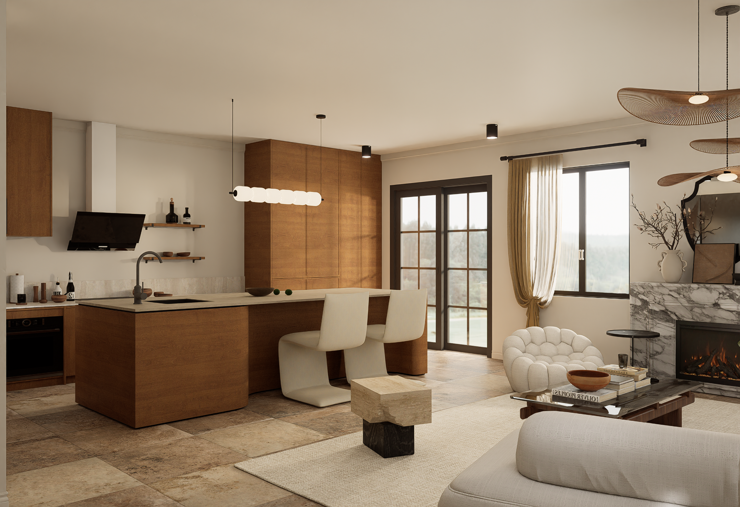 The heart of the home, designed with sleek cabinetry, sculptural lighting, and a balance of warm wood and cool stone. This space is both functional and refined, where minimalist lines meet tactile finishes to encourage effortless living and elegant entertaining.