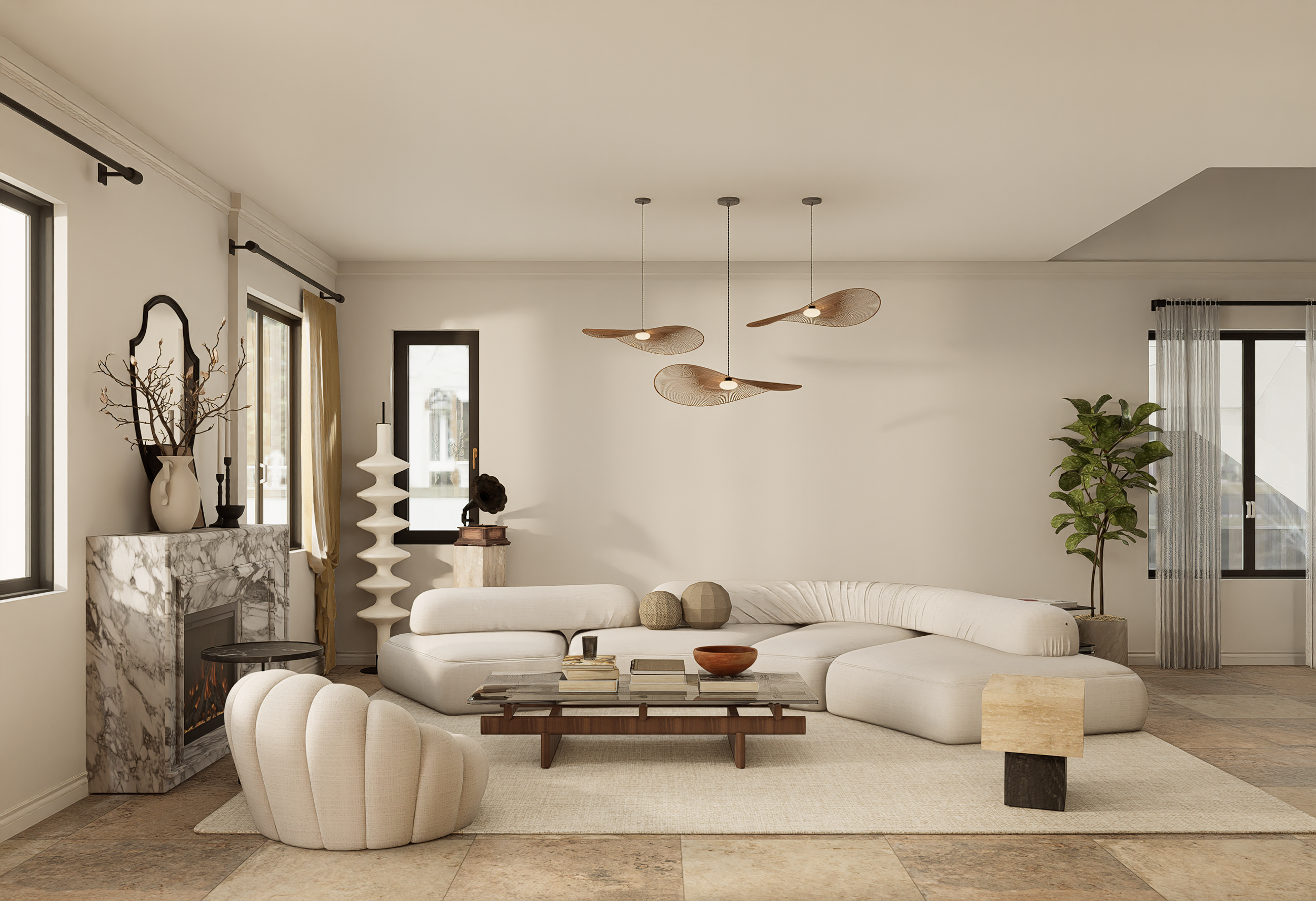 This design draws inspiration from nature’s organic forms and grounding elements, blending sculptural furniture, warm stone, and tactile neutrals to create a space that feels both modern and timeless. Every detail, from the fluid shapes of the seating to the natural veins of the marble, is chosen to encourage flow, calm, and a sense of effortless sophistication.