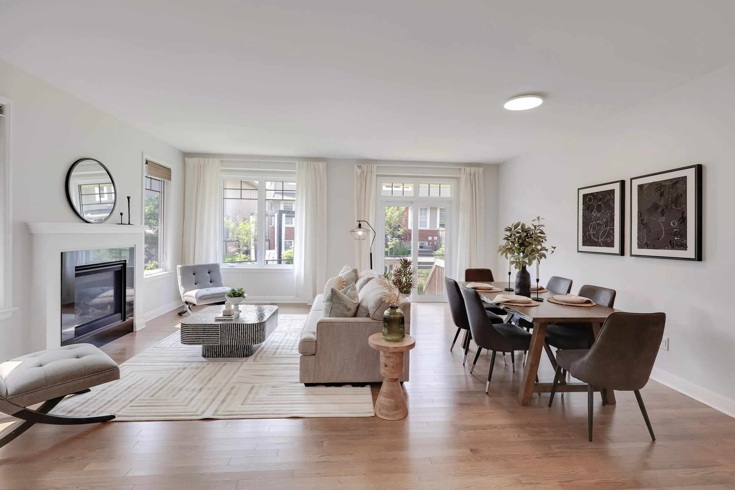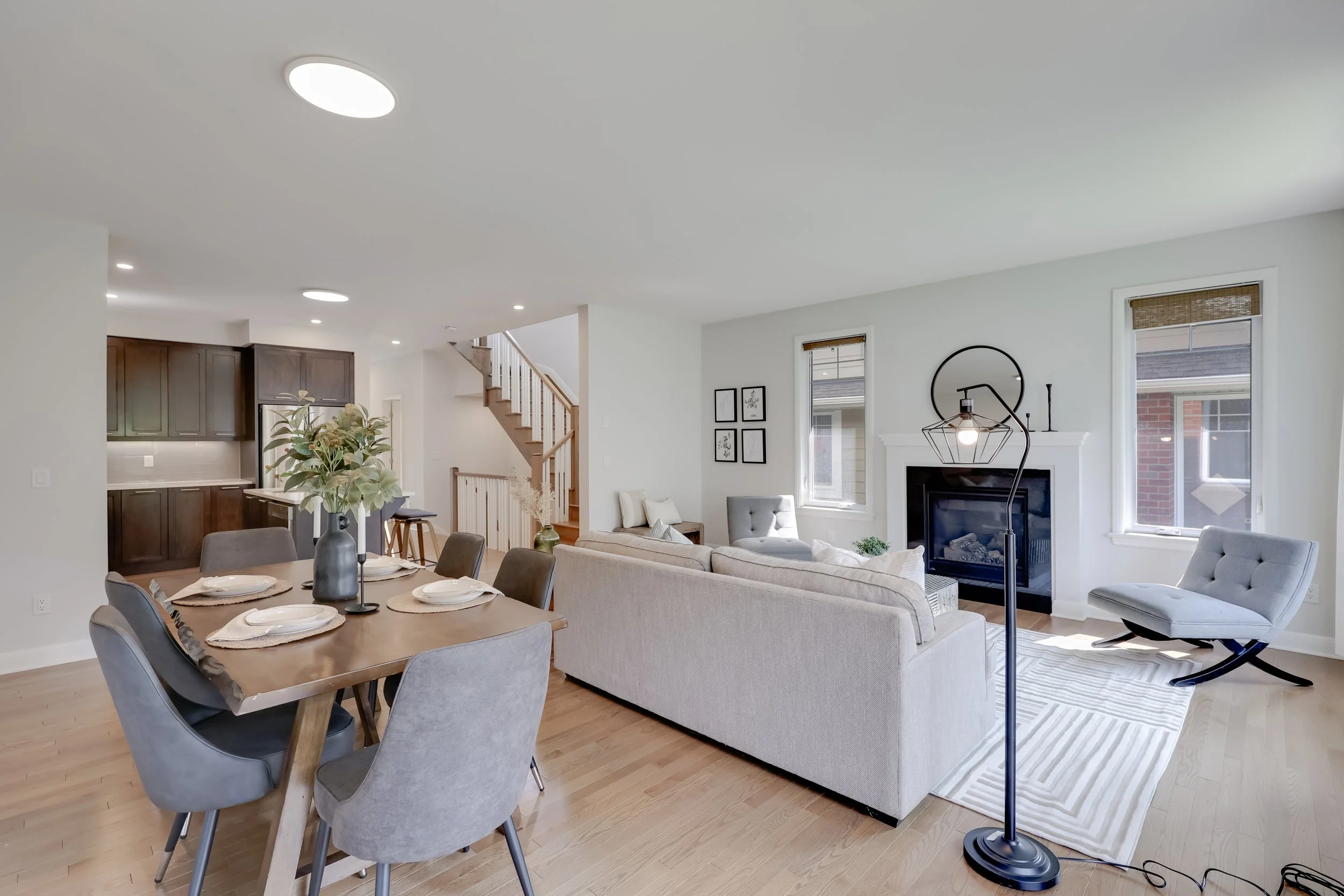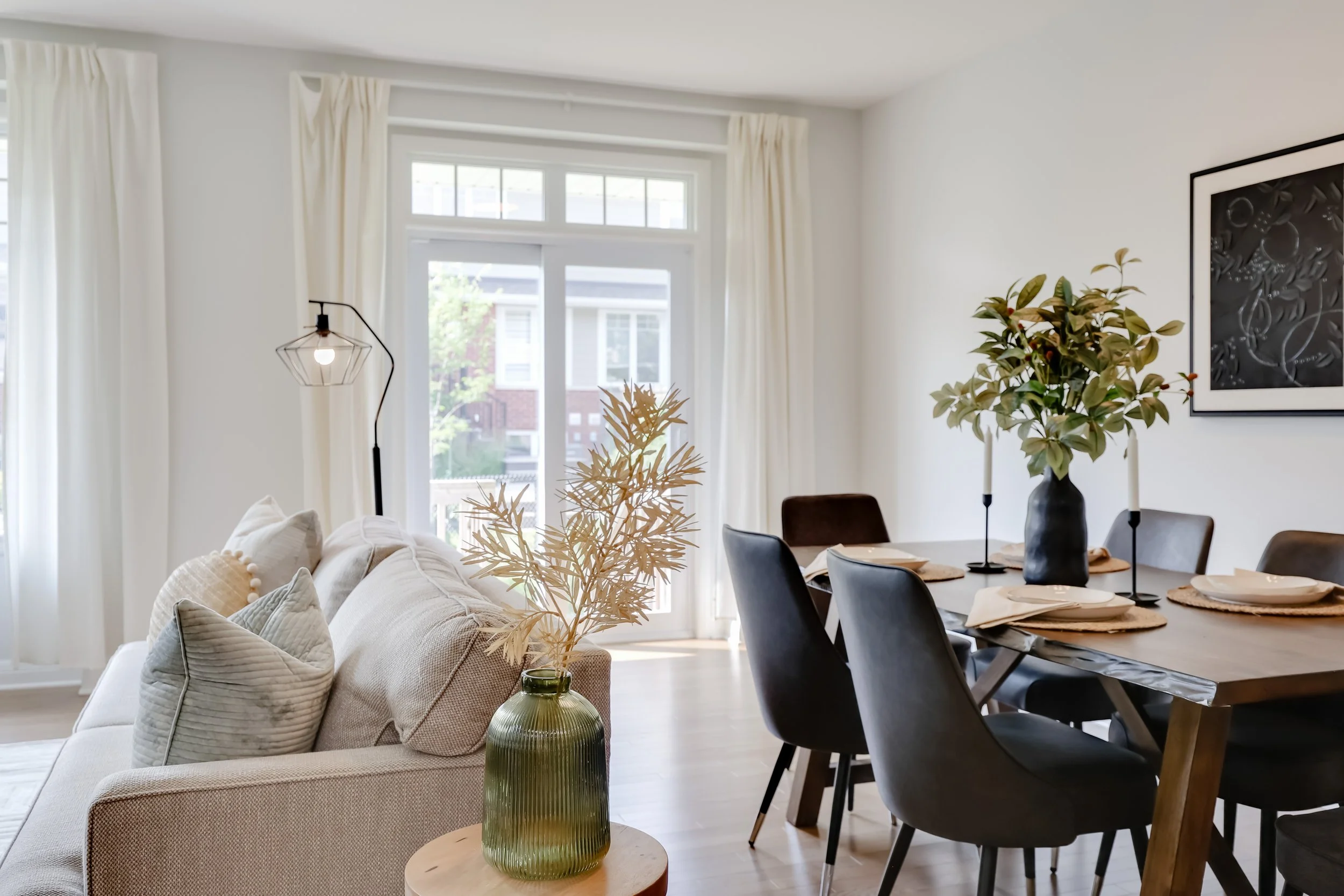 This project highlights how thoughtful staging transforms a clean, open layout into a warm and inviting retreat. With soft neutral tones, layered textures, and natural light flowing through oversized windows, we created a seamless connection between the living and dining spaces. The modern furniture and curated décor bring out the home’s best features—making it feel spacious yet cozy, sophisticated yet welcoming.